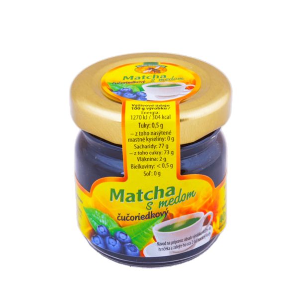 Zloženie: ovocie 45 %(čučoriedky), cukor, voda, matcha prášok 3,5%, med 5%, citrónová šťava, želirujúca látka: pektín, arómy